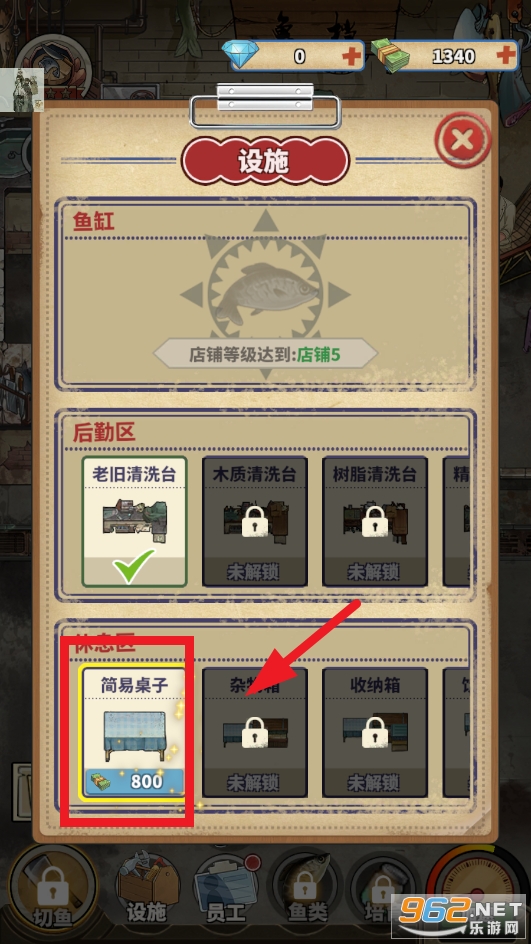 接着点击设施选项来购买鱼缸,之后也能在这个地方对鱼摊的设施进行升级。