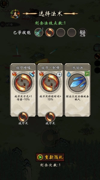 击败敌人能获取经验值,当经验值积累到满额完成升级后,就可以从三个强化技能里挑选一个。