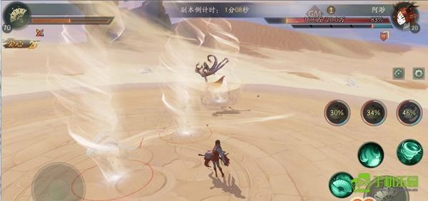 作为土系BOSS,阿渺有着20万的血量,它会每隔一段时间召唤蜃气妖,和这些小妖一起攻击玩家。不过一旦蜃气妖被消灭,阿渺的攻击力就会下降。此外,阿渺释放冲刺技能时,地面会留下三个龙卷风,这些龙卷风会在战场上持续8秒,玩家处于龙卷风范围内的话,妖气会被慢慢吸走。所以,玩家首先建议选木系妖灵,因为木系和土系属性相克,能打出更高的输出;其次一定要先快速清理掉蜃气妖,这样才能防止被阿渺造成大量伤害;最后要尽量躲开龙卷风,或者带上妖气获取速度快的妖灵来及时补充妖气。