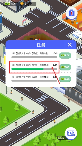 打开【任务】界面,确认【剧情片】板块里的【布景】升级目标是10级,目前进度为7/10,完成这个任务能够得到【500】的奖励。