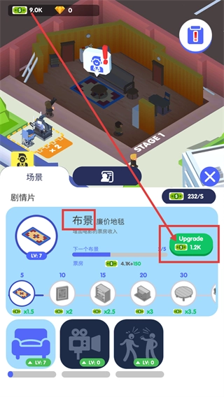 进入【剧情片】的场景界面后,找到【布景】模块,点击【Upgrade】按钮消耗相应资源,通过提升【布景】的等级来推进任务进程。