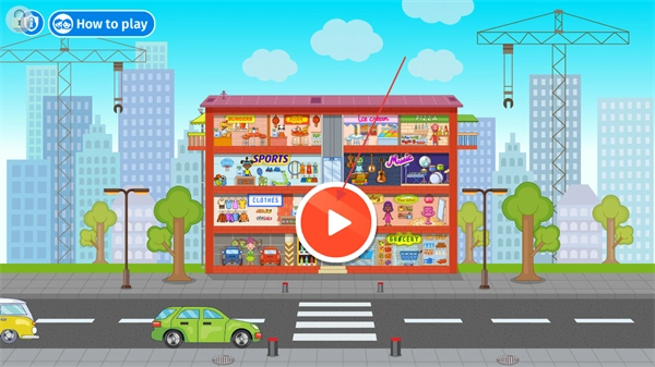 游戏主界面,这是一款模拟商铺互动类游戏的启动界面,展示了包含餐饮、运动、服饰等多种业态的多层商铺建筑,点击中间的播放按钮可进入游戏流程。