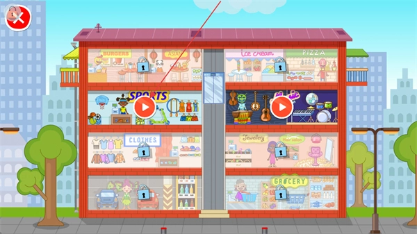 商铺楼层选择界面,此界面展示商铺的多层业态布局,部分区域标有锁形图标表示尚未解锁,点击已解锁区域的播放按钮,就能进入相应业态的店铺场景。
