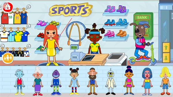 这是一个运动用品店的场景界面,陈列着各类运动服饰与器材。界面底部有一个角色选择区域,用户点击其中的对应角色,就能让该角色进入店铺,从而实现模拟顾客进店、角色试用商品等互动体验。