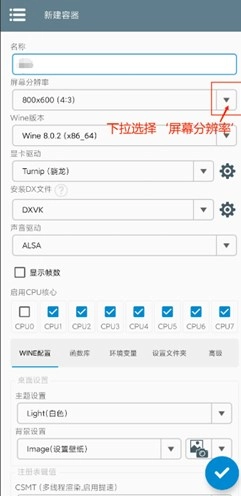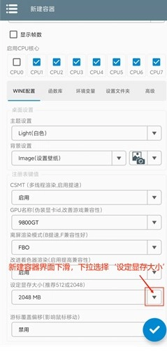 在新建容器的界面中向下滑动,然后通过下拉操作选择“设定显存大小”这一选项(这里建议手机配置比较低的用户,可以把显存大小调整得小一些)。