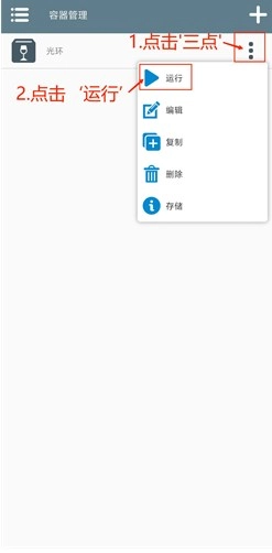 回到容器管理界面,找到刚才配置好的容器,点击其右侧的三点图标,在弹出的选项菜单里选择【运行】按钮。