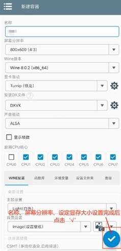 在完成名称、屏幕分辨率以及设定显存大小的配置后,点击界面上的“√”按钮即可。