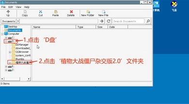 首先点击“D盘”,接着找到“植物大战僵尸杂交版2.1”文件夹——通过滑动屏幕让鼠标移动到该文件夹对应的位置,然后双击即可。
