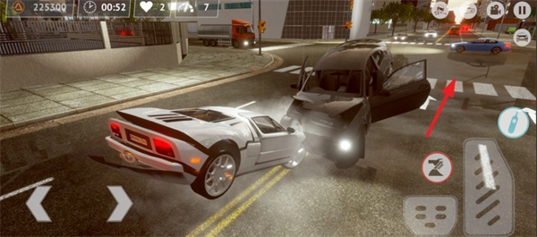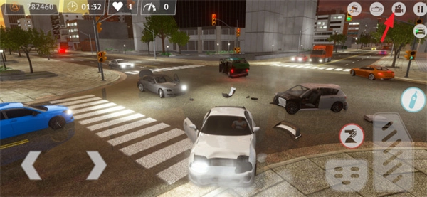 进入游戏后,挑选好汽车,即可进入开放地图展开竞技。左下角的两个按键负责控制移动方向,右下角的两个按键分别用于减速和加速。