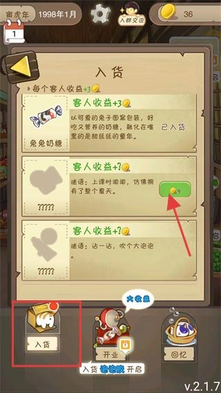 在入货界面,找到对应货品的“解锁”按钮(例如第二个客人收益)并点击,解锁新货品后就能提升店铺收益。