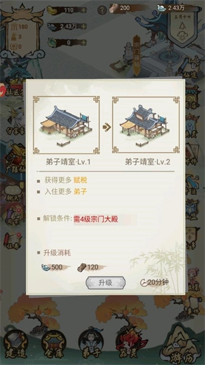 消耗银两与各类材料能够对建筑进行升级,持续提升宗门等级,以此打造出最出色的宗门。