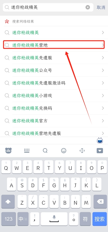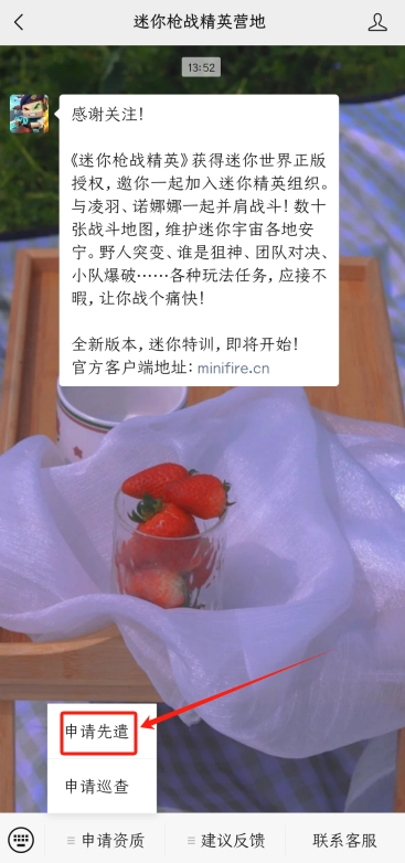 3、接下来打开微信,搜索“迷你枪战精英营地”,点击申请并完成注册,就能畅玩先遣服了。