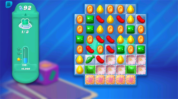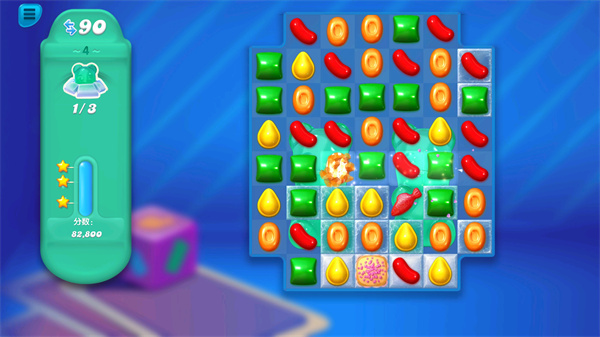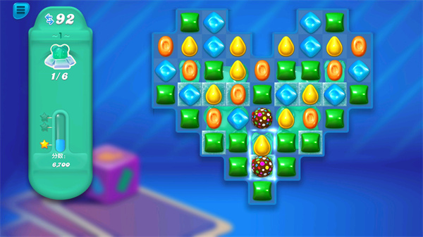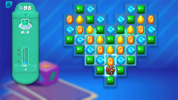 1、进入关卡后,会出现各种形状的糖果,只需简单滑动,若有三个相同且相邻的糖果,就能完成消除。