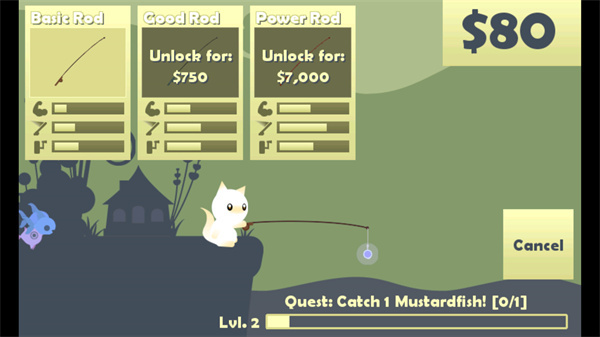 《小猫钓鱼》(Cat Goes Fishing)是一款卡通风格的休闲钓鱼游戏。玩家将操控一只软萌可爱的小猫体验钓鱼乐趣,游戏操作十分简单:只需甩出鱼竿,稍作等待即可钓起鱼儿,获得的金币还能用来解锁更高级的鱼竿和鱼饵。