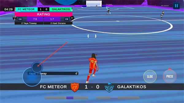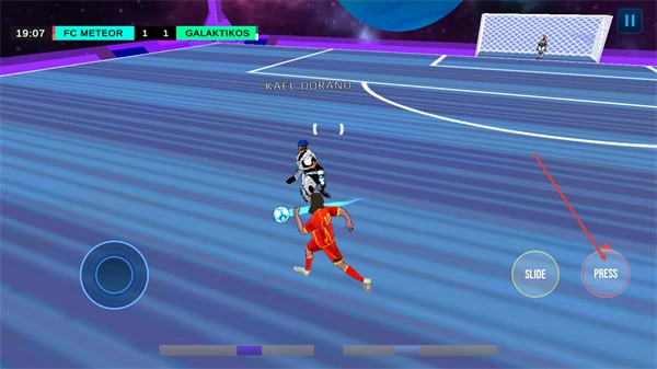 3、进攻过程中若遇对手防守,可点击PRESS按钮施压,尝试突破对方防线,推进球的位置,为后续传球或射门创造有利条件。