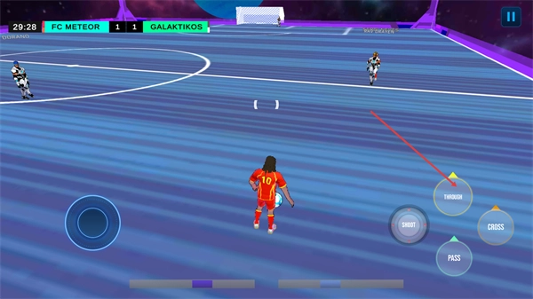 4、持球进攻时,可根据局势选择PASS传球、CROSS传中、SHOOT射门,或在合适时机点击THROUGH进行直传,与队友进行配合。