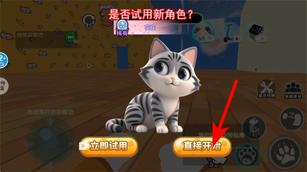 进入后选择初始地图房子,点击开始游戏,左下角控制前进后退,右下角操作跳跃、挥爪等动作,跟随右上角猫咪手表的任务提示行动,完成后获得鱼干,用于解锁后续场景与道具,躲避奶奶追击的同时完成破坏任务。