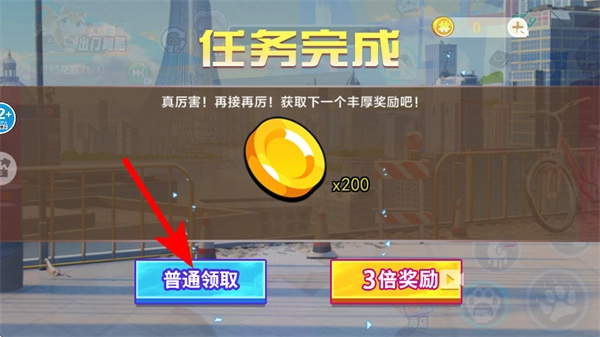 4、任务完成后点击普通领取按钮,获取关卡奖励如金币,推进游戏进度。