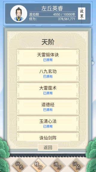 2、神兽部分:一个前期没用后期指着他活命的玩意。前期出了别管他,会有随机事件叫你帮忙,你帮忙之后会送你。中期随便养几只送的用来蹭点小修为,主要还是用来刷 人气和心态。到渡劫期之后迅速买金翅大鹏鸟,攒6400w升级成神兽之后去混天仙大会,一次70w+经验(这里每打一次都会掉1点人气,掉到七八十了就打几次地仙回上来就行)能不能第一世就狗到大乘全靠他了。大成之后把三足金乌买了,攒2亿5进化成凤凰,就可以愉快的混天仙会一二名了。