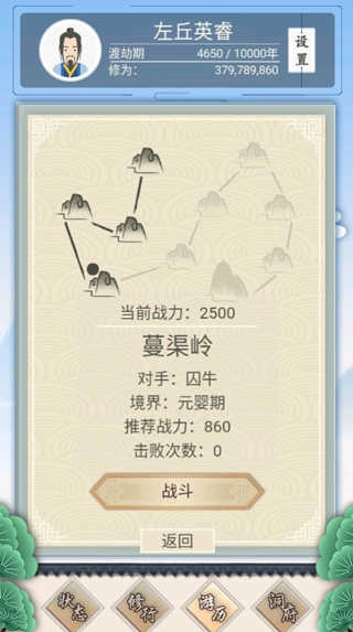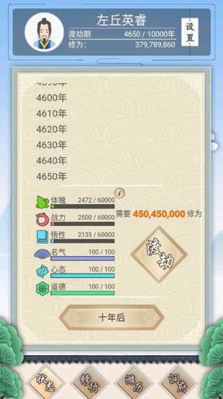 关于随机事件的选择,之前有位玩家分享过不同选项对应的结果,这里就不重复那些内容了,重点说几个关键要点:前中期阶段尽量采取保守策略,荒岛不要去探索,挖矿时别往深处挖,遇到陌生人就喂他们丹药;等进入渡劫期后,就可以直接去探索荒岛、深入挖矿,还有自己服用红色丹药(会略微降低道德值和体魄),这三个操作基本都能稳定获得大量经验。