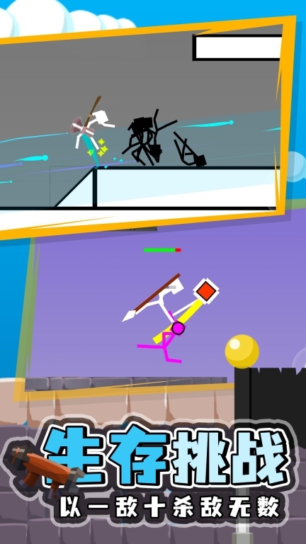 这是一款小型动作冒险闯关游戏。游戏初始阶段,你可以为火柴人英雄挑选手持的武器,不同武器的伤害效果各有不同!选好武器后,玩家还能设置武器的握持位置、摆出炫酷的攻击姿势,以及运用各种有趣的技巧来助力击败对手!