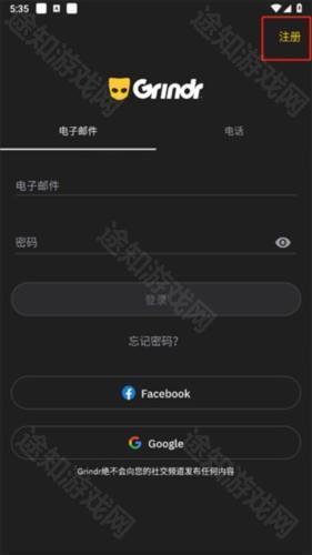 1. 开启Grindr软件,软件打开后,在登录页面的右上角点击【注册】。