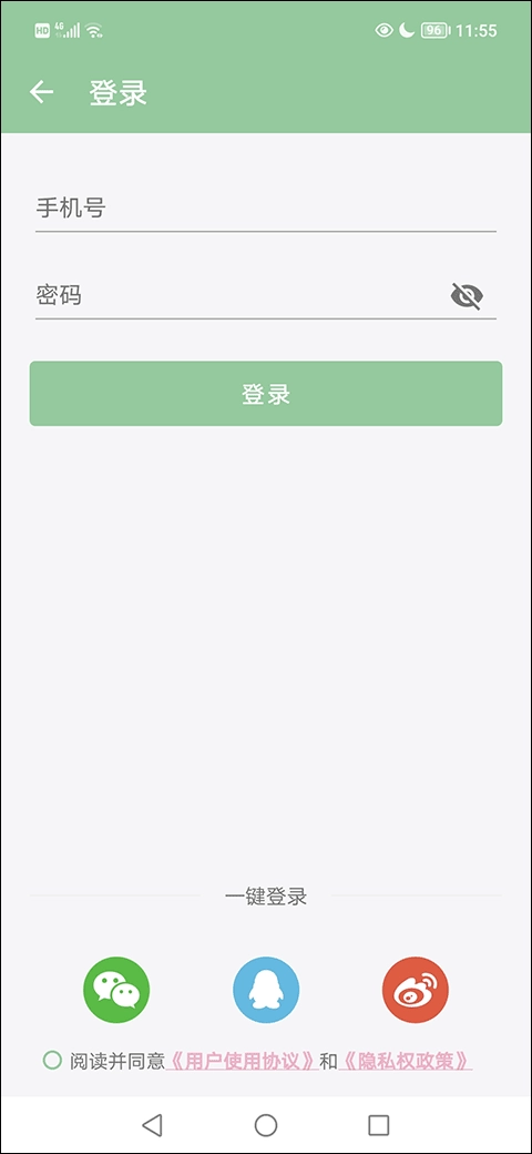 2、接下来,在登录界面勾选“阅读并同意用户使用协议和隐私权政策”,之后找到并点击“微信、QQ、微博”选项。