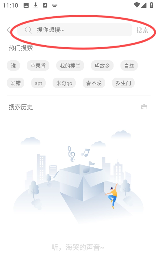 2、借助顶部搜索框,输入歌手名字或歌曲名称,能快速找到心仪的音乐。