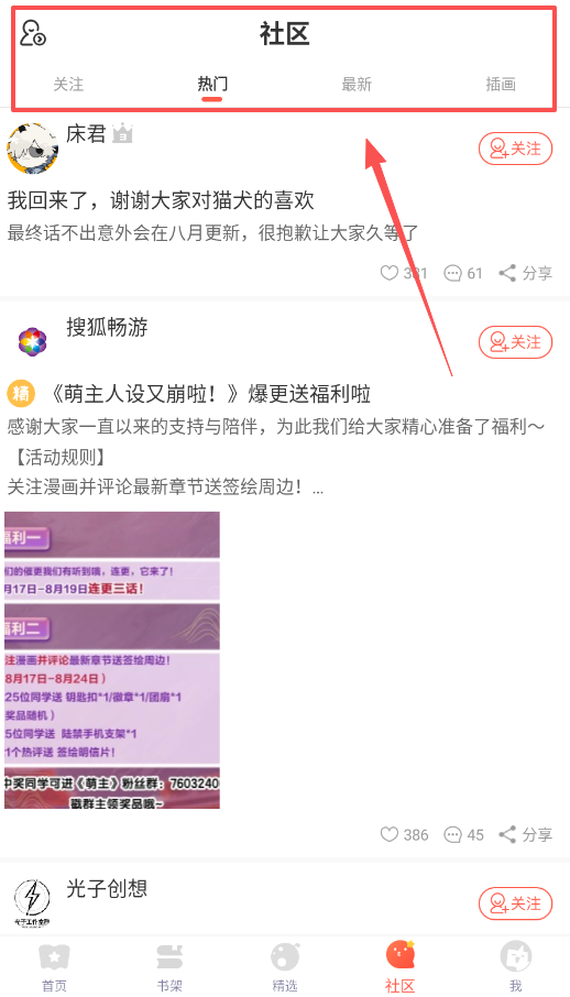 2、若想与作者互动或参与活动,可切换至社区页面。在该页面中,你能看到作者发布的更新通知,记得留意活动时间哦。