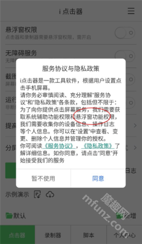 1、在魔趣网(m.mfunz.com)之后进入i点击器,需要留意并同意自动点击软件所需的多个权限。