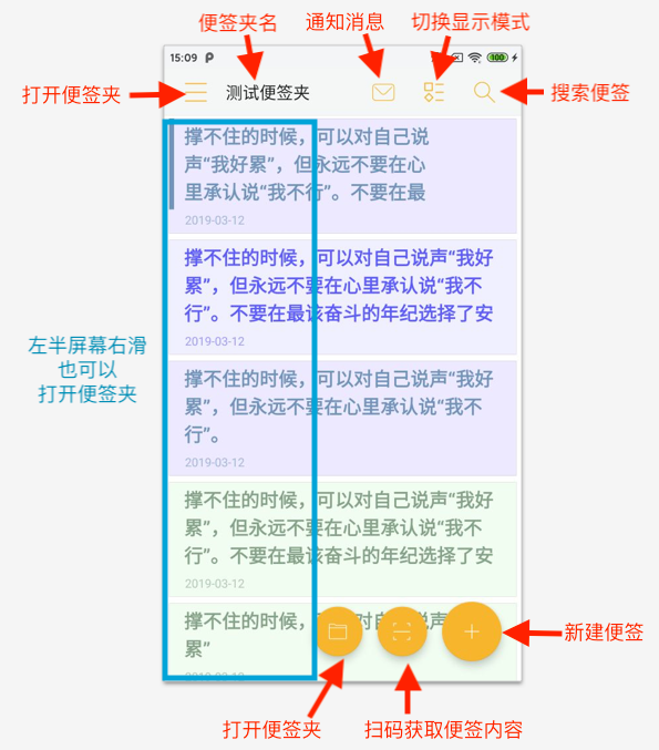 打开便签后,首先映入眼帘的便是首页,下面这张图对首页的主要按钮功能进行了说明。