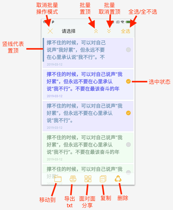 长按 首页的任意一条便签,进入批量操作 模式,如下图
