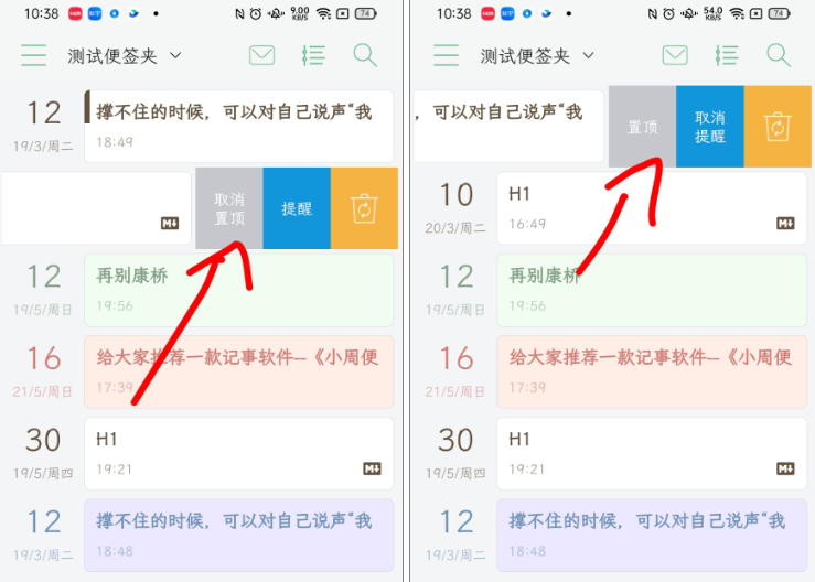 如下图所示,在首页向左滑动任意一个便签,即可打开侧滑菜单。