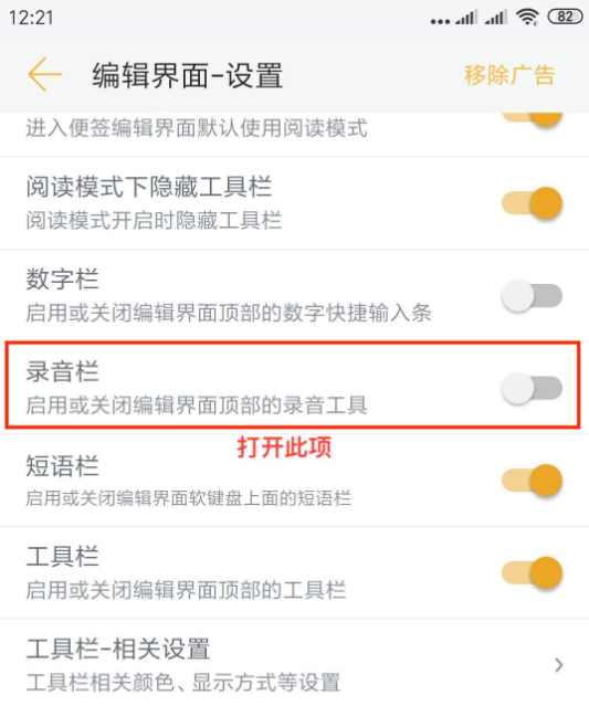 便签的录音功能默认处于关闭状态,若需启用该功能,可进入【编辑界面-设置】页面,开启【录音栏】选项。具体操作可参考下图: