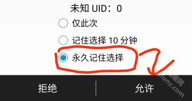 3. 当有特定应用程序申请root权限时,系统会弹出对应的界面,这时请勾选“永远记住选择”选项,再点击“允许”按钮来授予该权限。