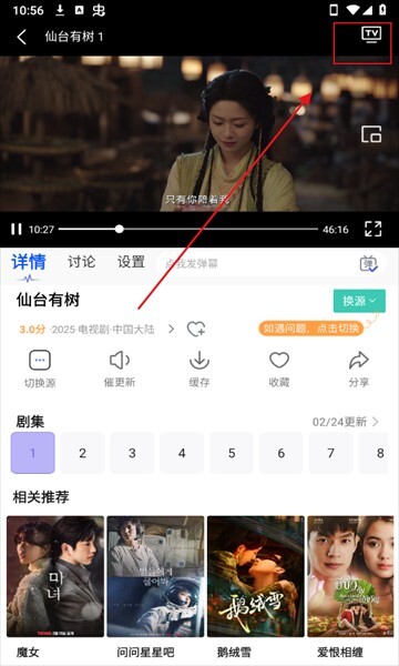 第2步,挑选自己喜爱的剧集进入播放页面,接着点击播放器右上角的投屏按钮。