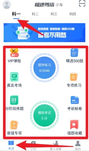 2、登录成功后会默认进入考试页面,用户能够在页面顶部切换科目分类,挑选当前需要练习的科目内容。