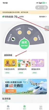 2、在福利页面,会展示绿色能量,这些能量可通过出行行为进行积累,用户能够消耗能量参与抽奖活动;皮肤商城提供了卡皮巴拉等主题的码面,同时还有机票券等权益,以此让出行过程更具趣味性。