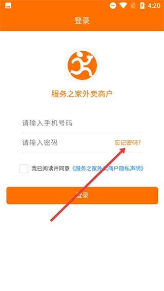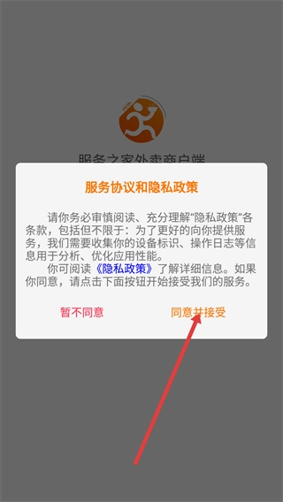 1、打开【服务之家外卖商户端】界面后,首先仔细阅读【服务协议和隐私政策】,随后点击【同意并接受】按钮,即可进入到后续的操作流程中。