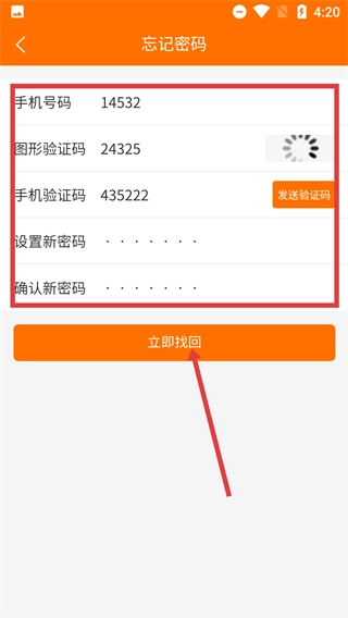 3、请按顺序填写【手机号码】【图形验证码】【手机验证码】,设置新密码并再次确认后,点击【立即找回】按钮,即可完成密码重置操作。