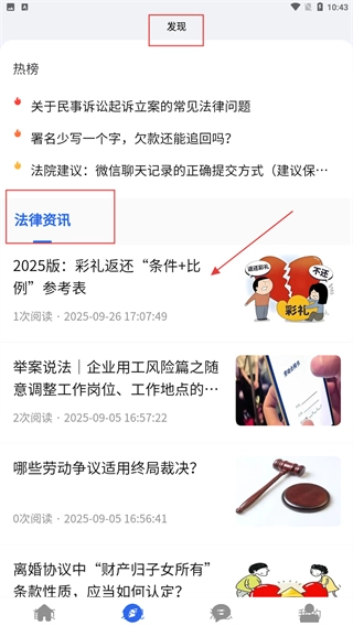 3、切换到“发现”页面下的“法律资讯”分类,挑选其他主题的资讯内容(例如《2025版:彩礼返还“条件+比例”参考表》),点击进入详情页面。