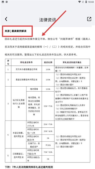 4、在彩礼返还资讯页面,可查看依据最高人民法院案例梳理的返还条件、比例及自查要点,并参考司法实践中的裁判规则。