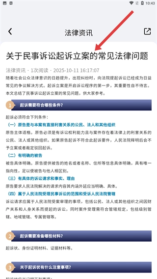 在资讯详情页面,用户能够查看起诉条件、所需材料、起诉状注意事项等法律相关内容,从而获取与诉讼有关的指引信息。