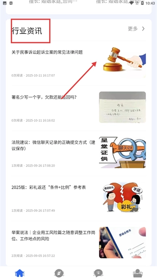 1、打开应用后,找到“行业资讯”板块,挑选你想要查看的法律资讯内容(例如《关于民事诉讼起诉立案的常见法律问题》),点击该资讯即可进入详情页面。