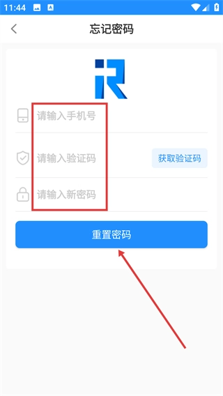 2、进入忘记密码页面后,按顺序填写【请输入手机号】【请输入验证码】【请输入新密码】这三项内容,全部填写完毕后,点击【重置密码】按钮即可。