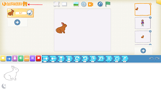 界面已更新,舞台区向右移动,程序置于中间,更方便程序员编程;区块区域不再严格划分,可以通过鼠标滑动选择区块,降低点击率,增加用户体验。